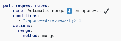 - El archivo de configuración se compone de una clave principal llamada pull_request_rules que contiene una lista de reglas.