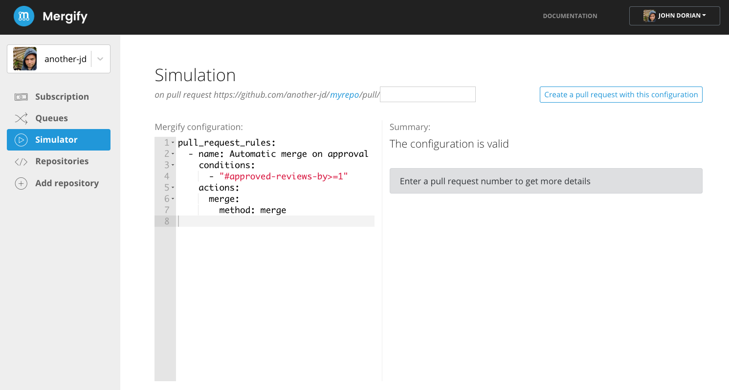 Vamos a crear una primera regla que hará merge a una pull request tan pronto como sea aprobada por un contribuyente.