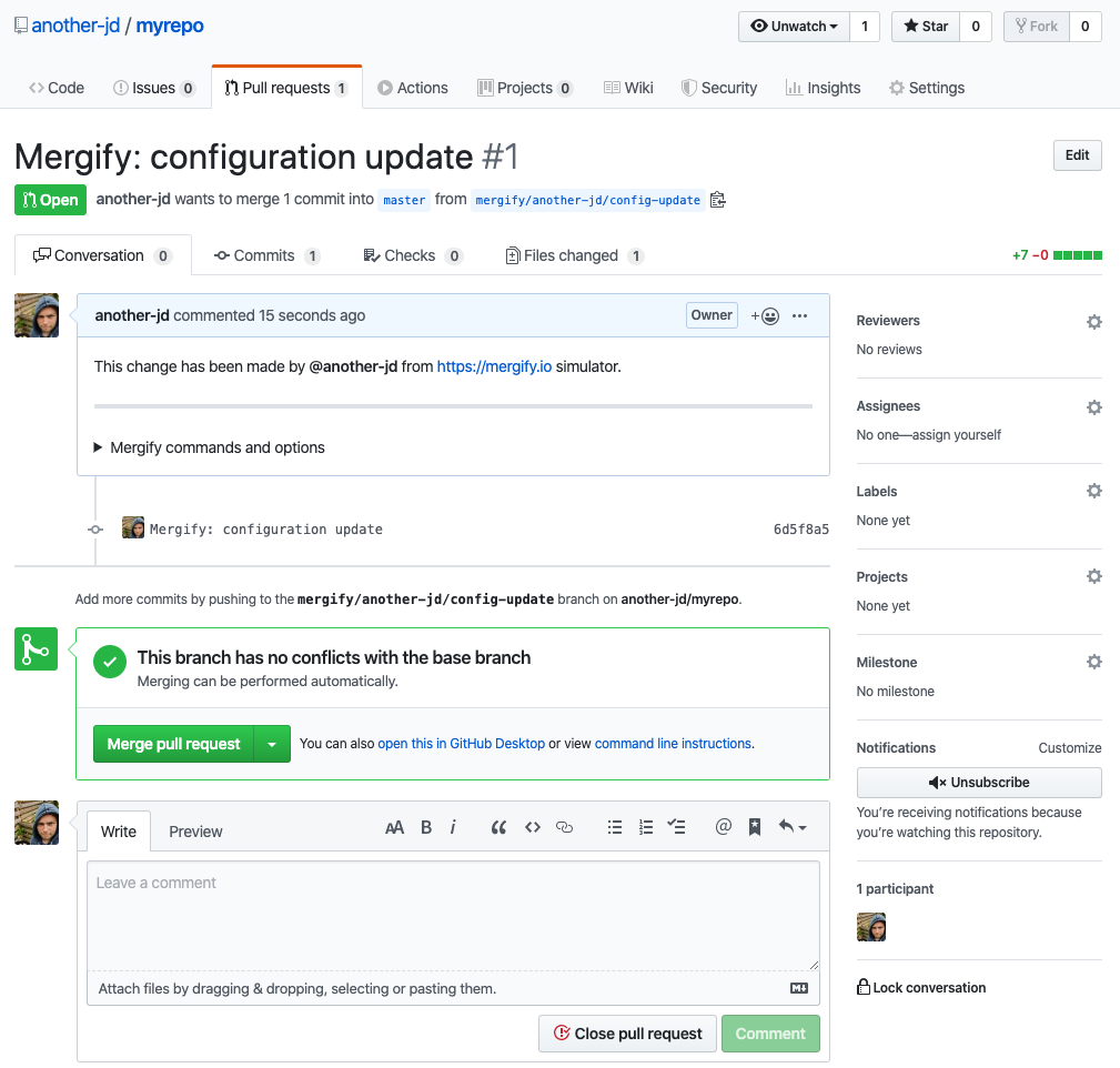 - Una nueva pull request será creada en tu repositorio con la nueva configuración de Mergify.