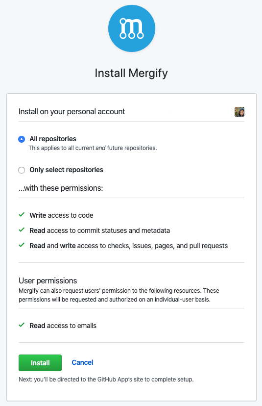 - GitHub ahora te ofrecerá seleccionar los repositorios a los que quieres dar acceso a Mergify. Selecciona el repositorio que gustes, o todos si lo deseas.