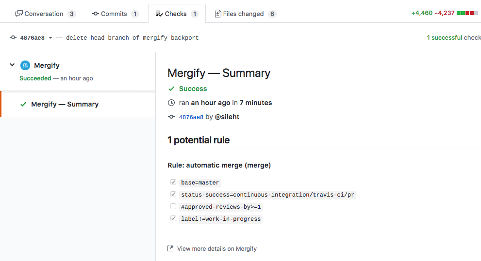 Cuando todos los criterios de las reglas sean satisfechos, Mergify ejecuta las acciones configuradas y realiza el merge.